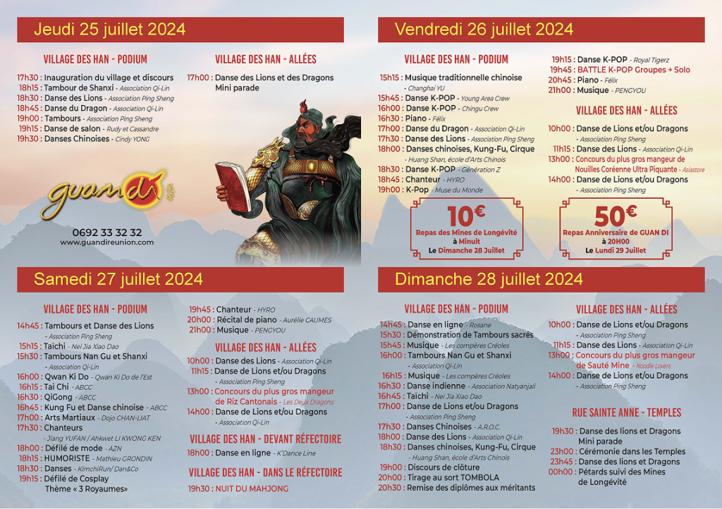 Guandi Réunion vous présente ses lions et dragons ! Ils seront prêts cette année pour l’ouverture du Village des Han et défileront du Jeudi 25 juillet au lundi 29 juillet dans l’école Centrale et devant le temple pour le plus grand bonheur des visiteurs.